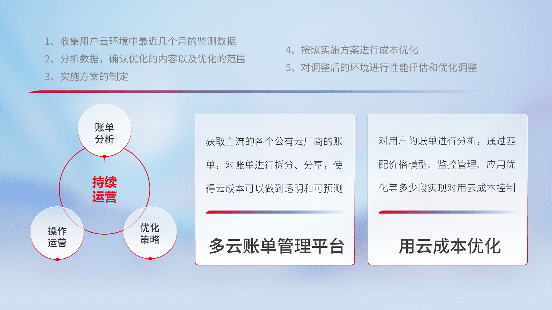 通过多云纳管,,以统一的资源数据模型把客户的云资源进行抽象和封装,,,,进而实现对多云资源的统一操作,,,保障云资源管理的可靠性、、、、稳定性与可用性。。。。量身定制化运维内容,,,配置、、、、开发运维、、、补丁管理、、、备份、、、、监控、、认证和访问管理、、审计和日常巡检等,,保障在用云过程中的可靠度,,稳定度以及高可用率。。。。